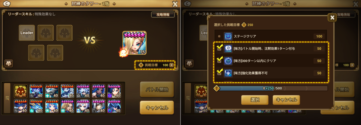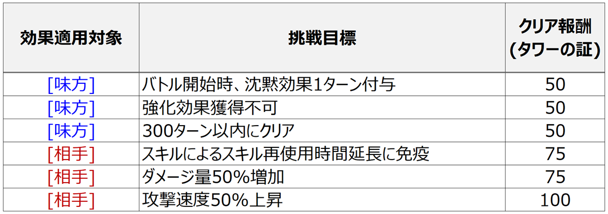 挑戦目標は毎月15日の試練のタワーリセットと同時に更新され、更新されるまでは全ての階(1~10階)で同じ条件が適用されます。