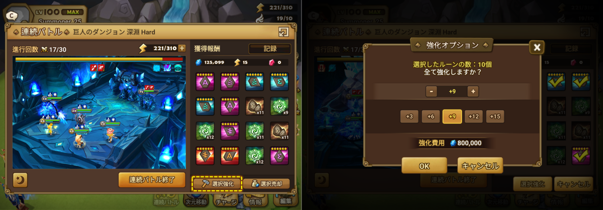 ・連続バトルの終了後や【ルーン管理】メニューに、獲得したばかりのルーンや保有中のルーンを一度に強化できる【選択強化】機能が追加されます。