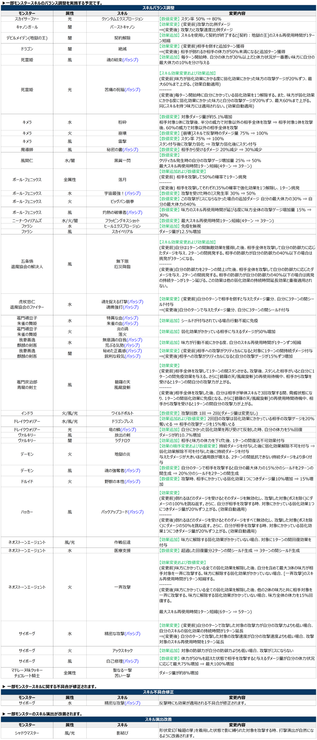 【2025/9/27】モンスタースキルのバランス調整について アップデート 2025.09.29 スポンサーリンク スポンサーリンク スポンサーリンク スキルのバランス調整が行われるようです。影響が大きそうな注目の調整はこちら! 闇ドラゴンナイト(ラグドール):追加ターン獲得条件の緩和 火キメラ(ラカン):反撃のダメージ増加 ドレイクウォーリア:攻撃ゲージ吸収の条件緩和 Visited 282 times, 1 visit(s) today