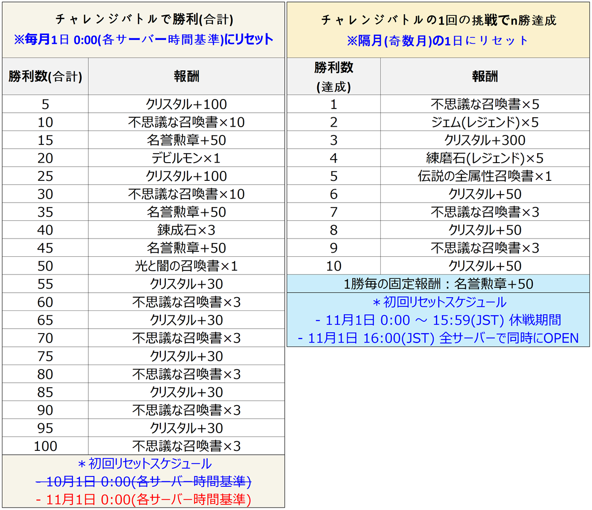 ・【チャレンジバトルの報酬(合計勝利報酬)】:毎月1日 0:00(各サーバー時間基準)にリセットされます。