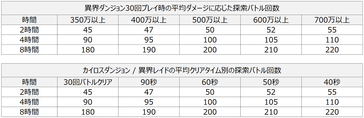 ※カイロスダンジョンと異界の狭間でクリア済みのダンジョンと階を選択可能。 - 連続バトルの平均クリア速度によって最大220回までバトル可能回数が増加します。