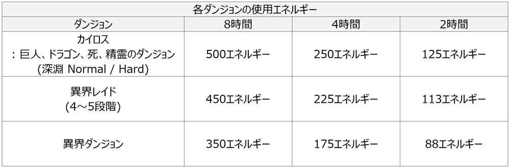 - 一日500エネルギーまで、カイロスダンジョンと異界の狭間でレジェンドランクのアイテムがドロップする確率が最大で5倍以上上昇します。