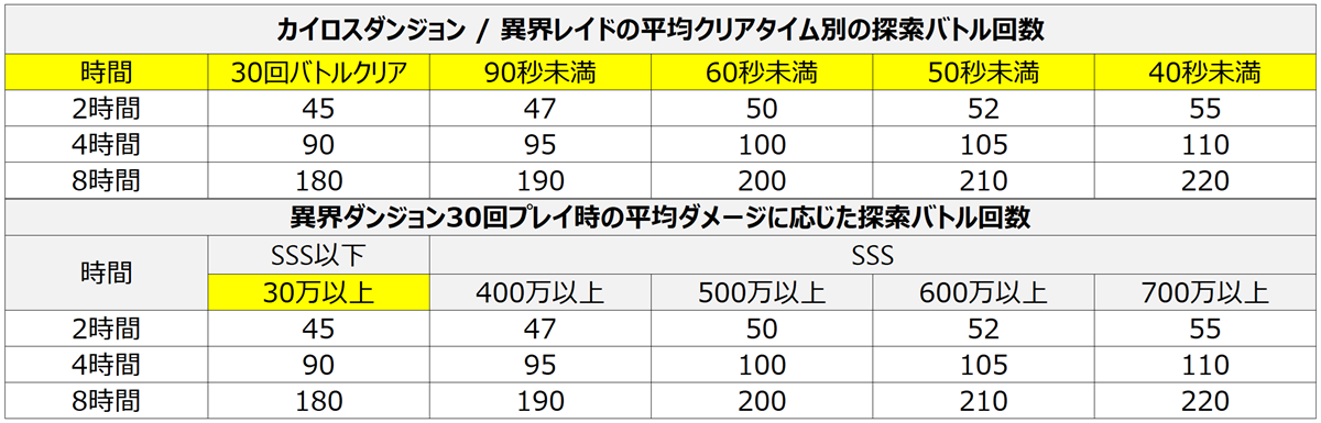 カイロスダンジョンと異界レイドは30回連続バトルをクリアした最も高い難易度のダンジョンでのみ探索バトルを進行でき、30回連続バトルの平均クリアタイムが短いほど探索バトルの回数が増えます。