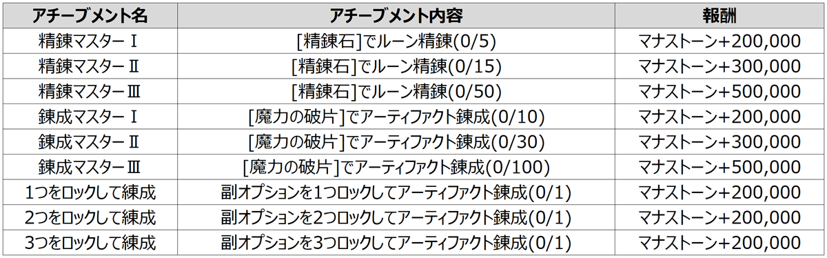 精錬およびアーティファクト錬成関連の新たなアチーブメント追加