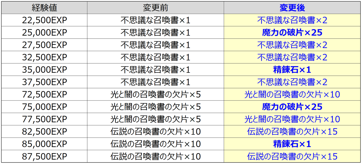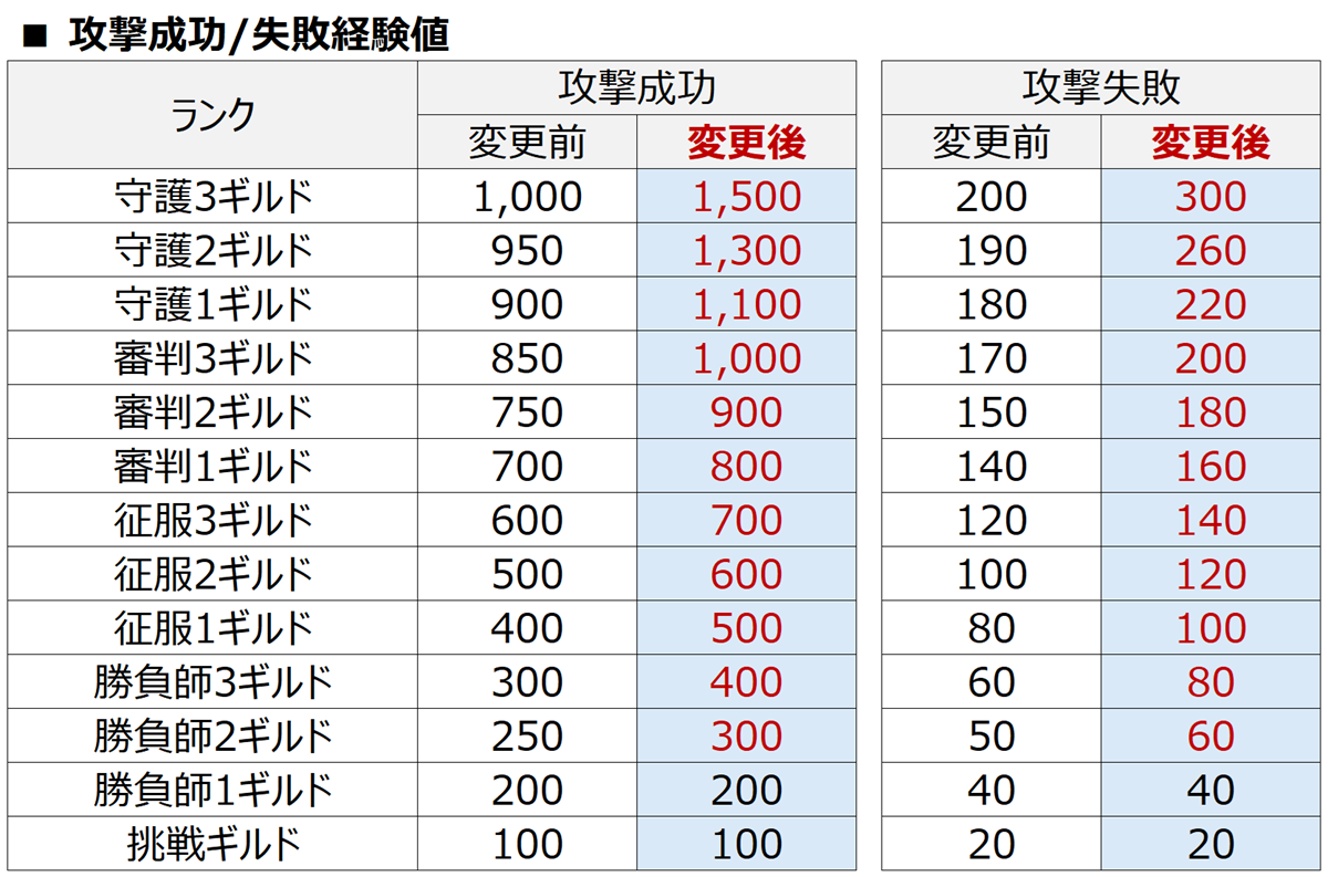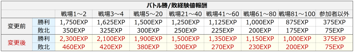 • 経験値報酬が変更されます。