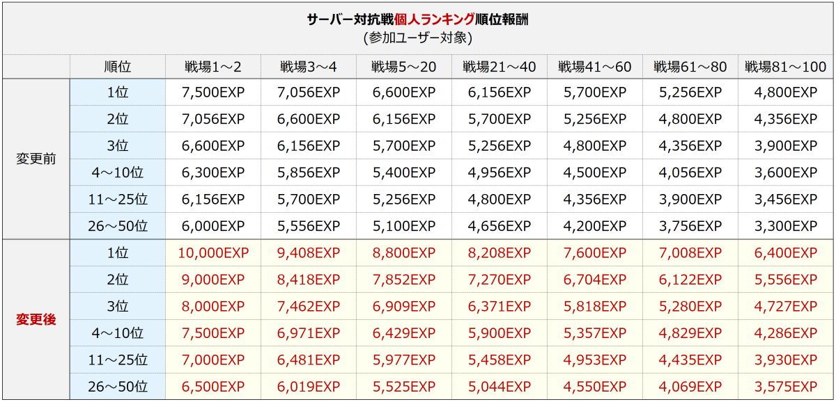 • 個人ランキングに応じて獲得する名誉経験値報酬が上方調整されます。